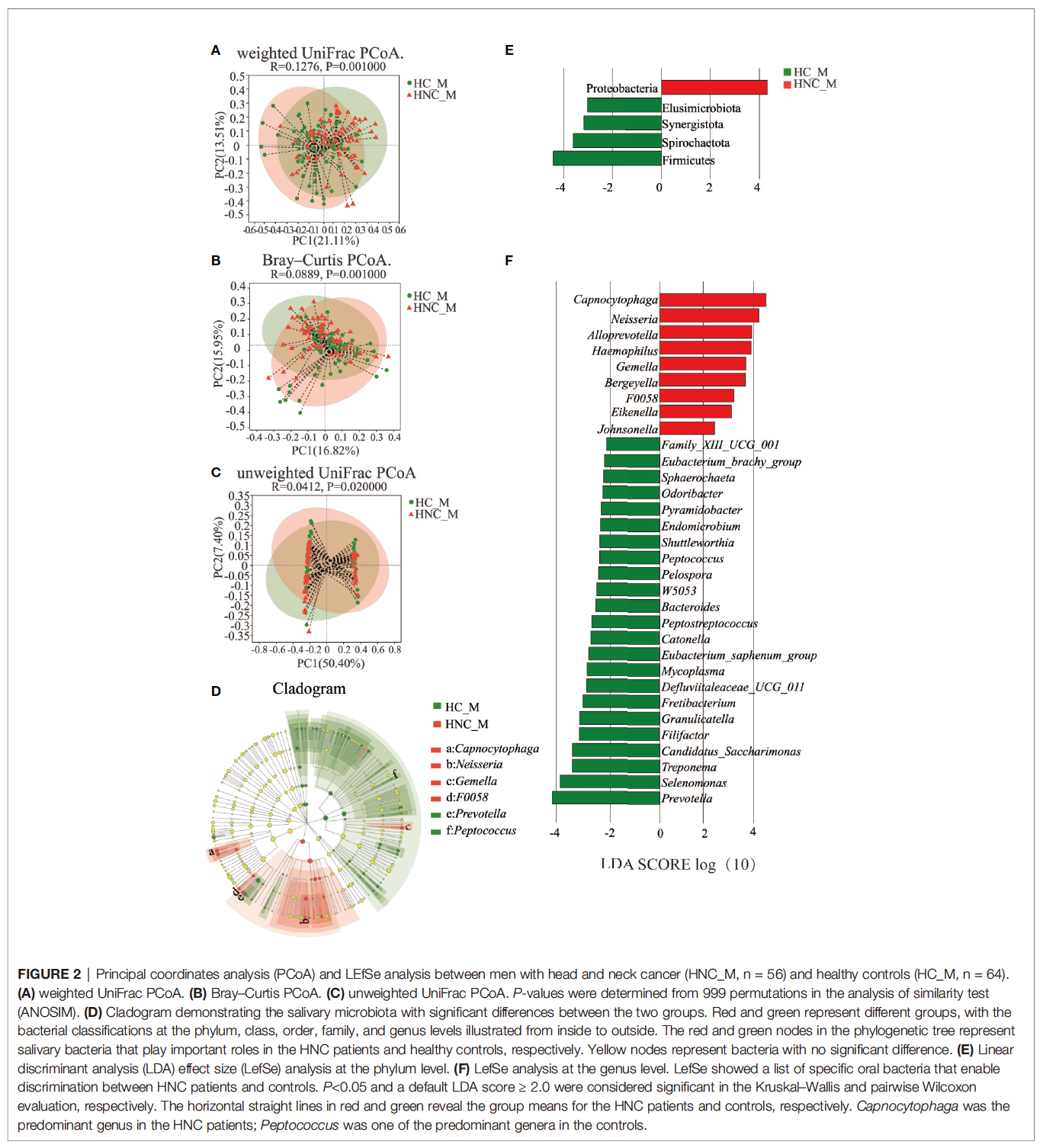 图2 头颈癌男性患者和健康对照者的主坐标分析(PCoA)和LEfSe分析