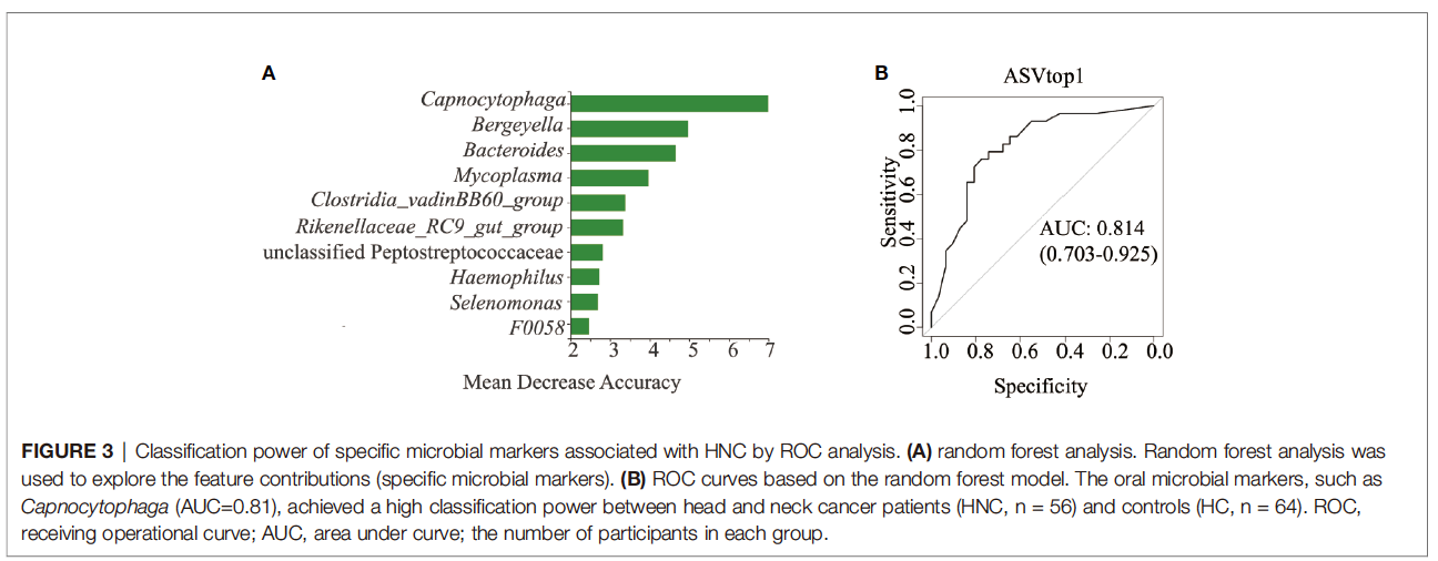 共纳入56例患者,其中47例(83.9%)为喉癌,9例(16.1%)为下咽癌,和64例健康对照者。HNC患者的嗜碳酸细胞丰度增加。口腔微生物标志物如二氧化碳噬纤维菌属(曲线下面积=0.81)在HNC患者和健康对照之间获得了较高的分类能力。此外,在区分HNC患者与健康对照时,与单独使用口腔菌群标志物相比,使用口腔微生物标志物分类(比如:二氧化碳噬纤维菌属)结合嗓音/言语困难症状的总体预测准确率更高(79.2% VS 92.5%)。