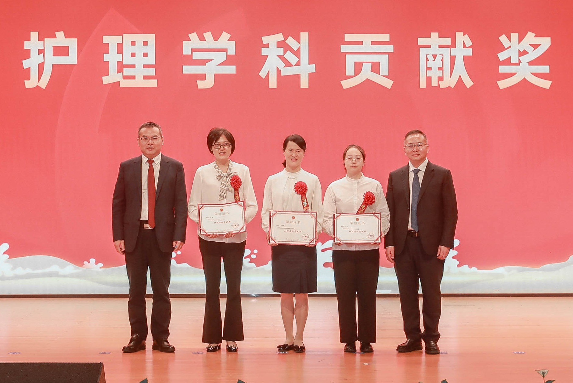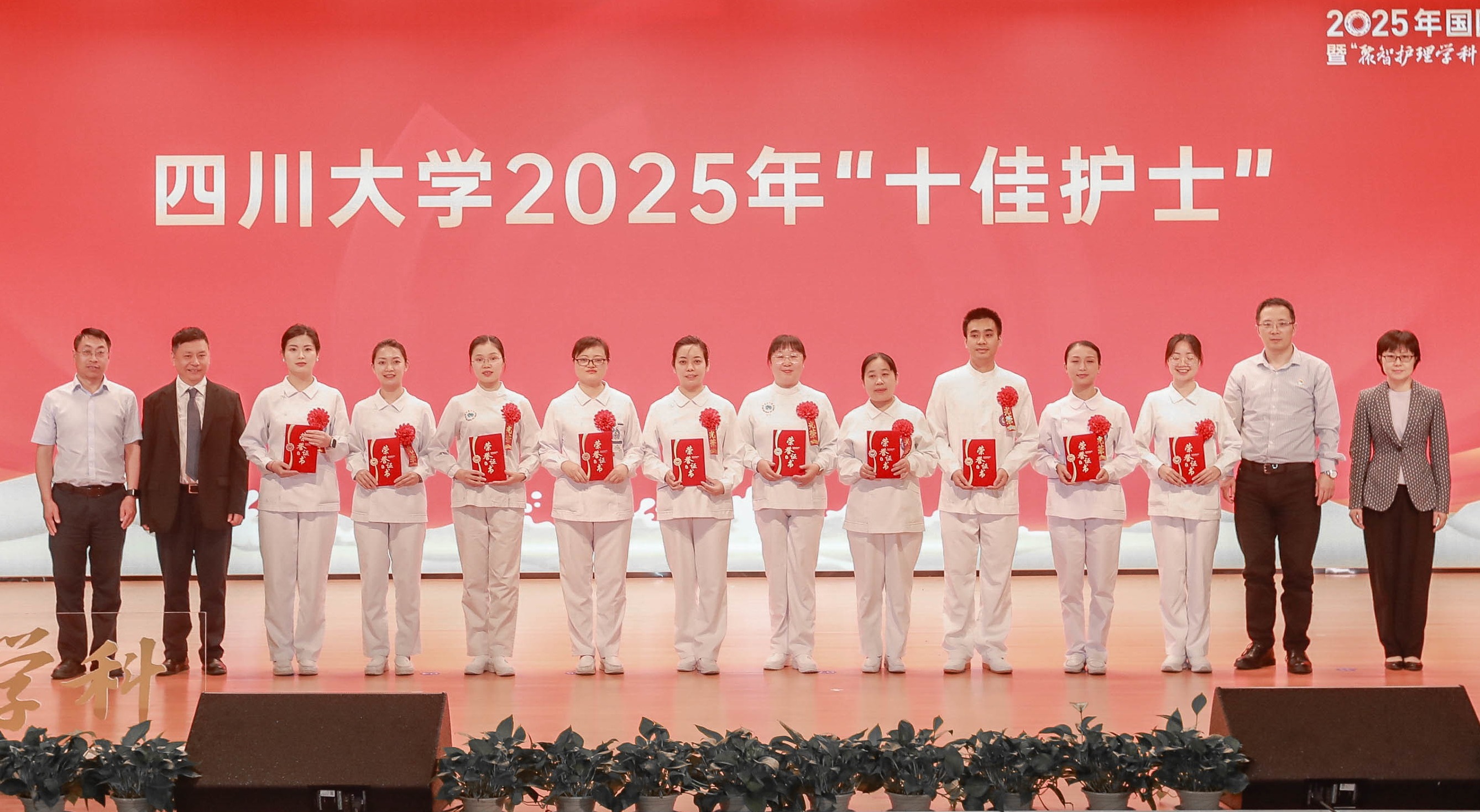 英国上市365官网工会袁斌常务副主席、华西第二医院牛晓宇副院长、华西口腔医学院(华西口腔医院)祝颂松副院长、华西公共卫生学院(华西第四医院)沈江副院长为英国上市365官网2025年十佳护士颁奖