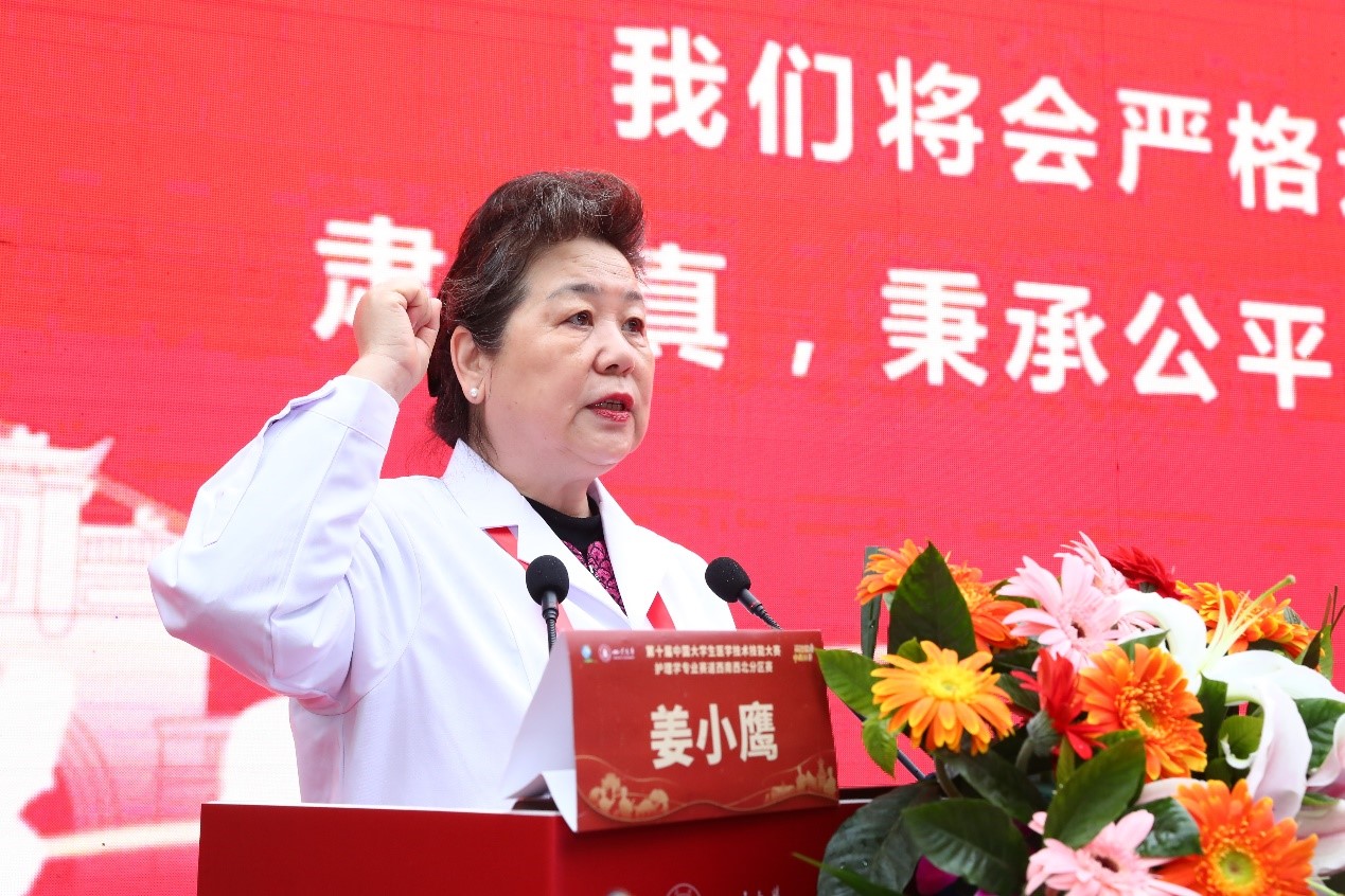 总裁判长姜小鹰教授在致辞中表示,大赛的宗旨是要打造一场独具中国特色,具有深意影响深远的高端医学教育赛事,并借此推动医学实践教学改革,培养人民健康所需求的顶尖医学护理人才,以赛促学,以赛促教,以赛促改,全面提升新医学教育的改革与发展。希望各位选手严格遵守比赛规则,认真履行和承担权利和义务,赛出水平,赛出风采,夺取技能操作和文化素养的双丰收。之后,姜小鹰教授代表裁判宣誓,将在比赛中,严肃认真,公正裁判,严格遵守裁判员纪律,尊重参赛选手,履行裁判员职责,创造公平公正的比赛环境,圆满完成各项裁判任务。