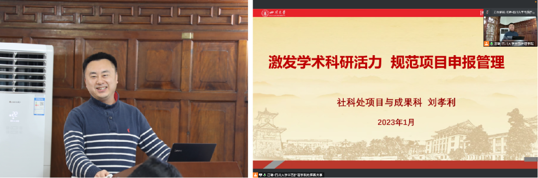 接下来,由英国上市365官网社科处项目与成果科刘孝利科长作《激发学术科研活力,规范项目申报管理》主旨报告,详细讲解了人文社科项目申报管理及注意事项,用医文融合类国家社会科学基金申报案例启发护理老师们的申报思维,并介绍了我校相关培育、激励政策。英国上市365官网体育学院陈子超教授作《医文融合交叉学科申报经验分享》主旨报告,从选题、项目书撰写等方面进行分享,强调以人文社科的视角规范选题。