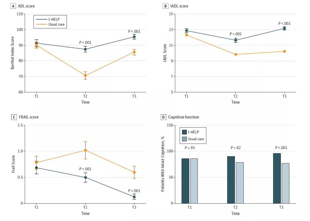 A.对照组平均ADL (Barthel指数)在出院时及出院后30天均低于t-HELP组;