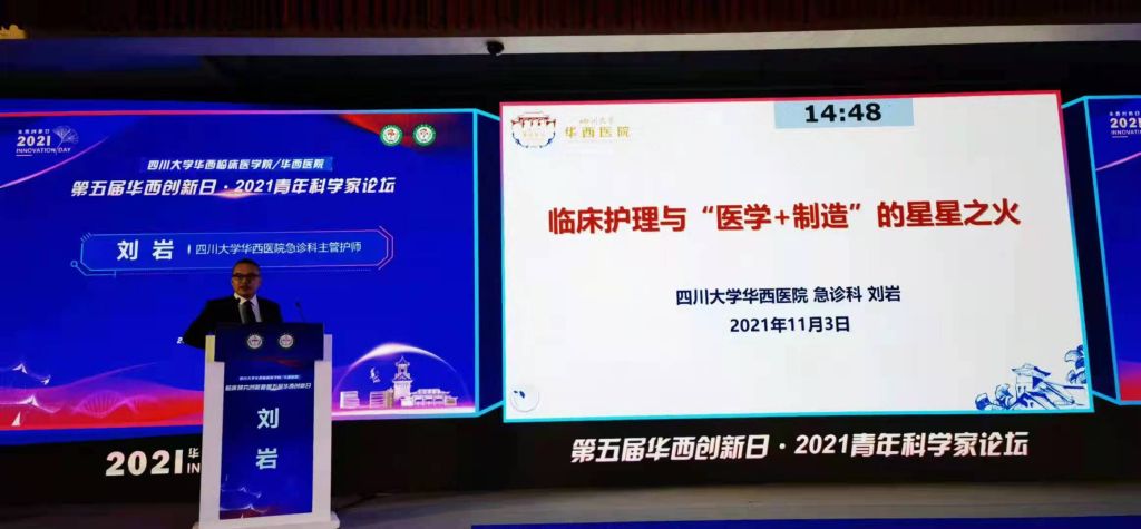 在第五届华西创新日·2021青年科学家论坛上,刘岩老师围绕《临床护理与“医学+制造”的星星之火》为题进行了成果分享。他所在团队秉承以“源于临床、高于需求、用于临床、精益求精”的临床护理创新理念,借助“医学+制造”的东风,研发了乳胶手套、自制气管切开固定带、医用正压送风防护头罩等护理创新产品,其中,滑动集水杯式呼吸机管路荣获第三届中华护理学会创新发明奖三等奖。