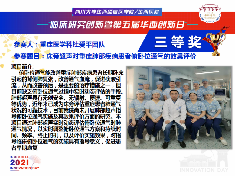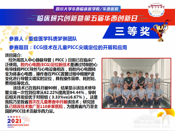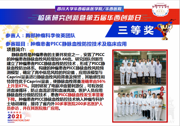在临床研究创新暨第五届华西创新日论坛上,护理硕士生导师李俊英教授团队的《肿瘤患者PICC静脉血栓防控技术及临床应用》、硕士生导师唐梦琳教授团队的《ECG技术在儿童PICC尖端定位的开展和应用》及杜爱平老师团队的《床旁超声对重症肺部疾病患者俯卧位通气的效果评价》荣获临床新技术擂台赛三等奖。