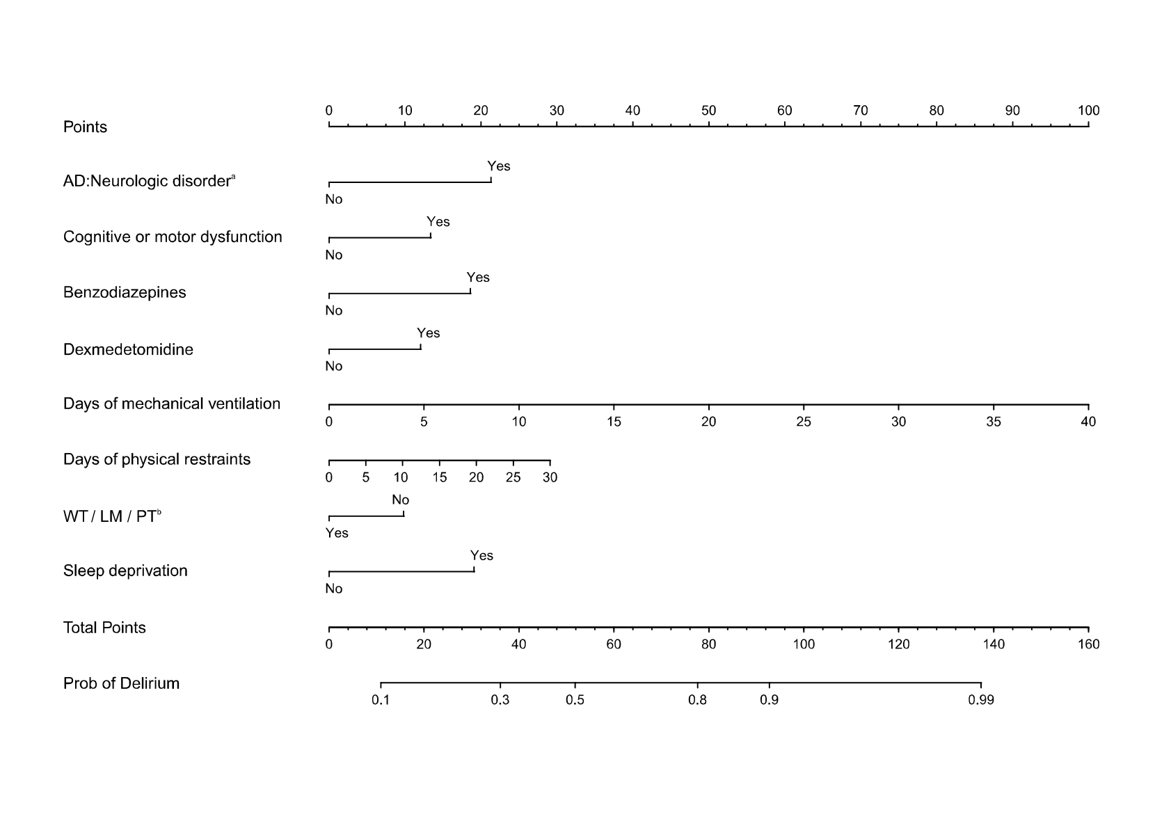 图1. Nomogram for estimating delirium in critically ill children(a: admission diagnosis; b: watching television/listening to music/playing with toys)