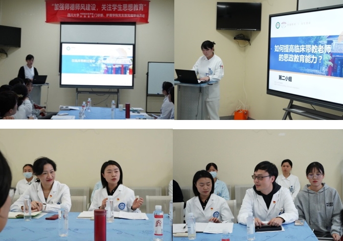随后,活动由小组汇报、讨论、分享、总结四个环节进行。门诊部护理教师代表分别就前期各自讨论的主题进行了汇报。在讨论及分享环节,门诊部副主任曾利辉、各护理单元护士长及护理学院党支部代表分别就思政教育的定义、内涵、学员特点、学员需求、实施过程中的困难及经验等进行了积极讨论和分享。