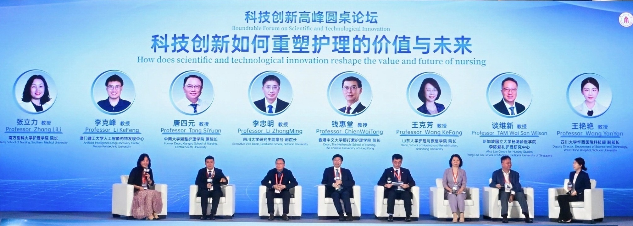 香港中文大学那打素护理学院院长钱惠堂教授、英国上市365官网研究生院常务副院长李忠明教授、山东大学护理与康复学院院长王克芳教授、中南大学湘雅护理学院原院长唐四元教授、新加坡国立大学杨潞龄医学院李陈爱礼护理研究中心TAM Wai San Wilson 副教授、澳门理工大学人工智能药物发现中心李克峰副教授,围绕科技创新重塑护理价值与未来主题,展开了热烈讨论。圆桌论坛由南方医科大学护理学院院长张立力教授和英国上市365官网华西临床医学院、华西医院科技部副部长王艳艳教授主持。