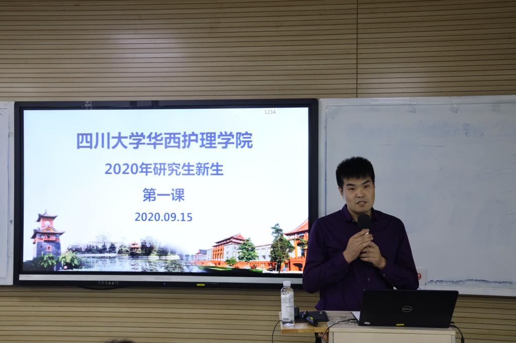 硕士研究生班主任刘常清进行学习经验分享。他讲到同学们要加强自主性和创新性,不仅在学术上学习老师的科学研究方法,更应在为人处事方面学习师者的德行。2020级博士生黄川雅代表新生作表态发言,她说作为学生应当自觉将川大华西文化融入进自己的一言一行中,为华西护理的发展贡献自己的一份力。