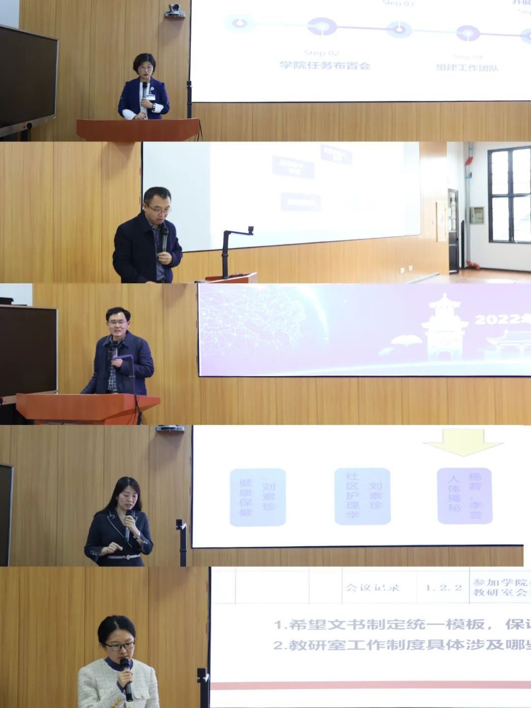 王坤杰副院长在会上肯定了护理学院各基层教学组织的辛勤付出和取得的突出成绩,强调要继续加强教研室建设,夯实基层教学组织保障,并鼓励各教研室、各实践基地建言献策,为2023版护理学本科人才培养方案修订及护理教育教学贡献智慧和力量。