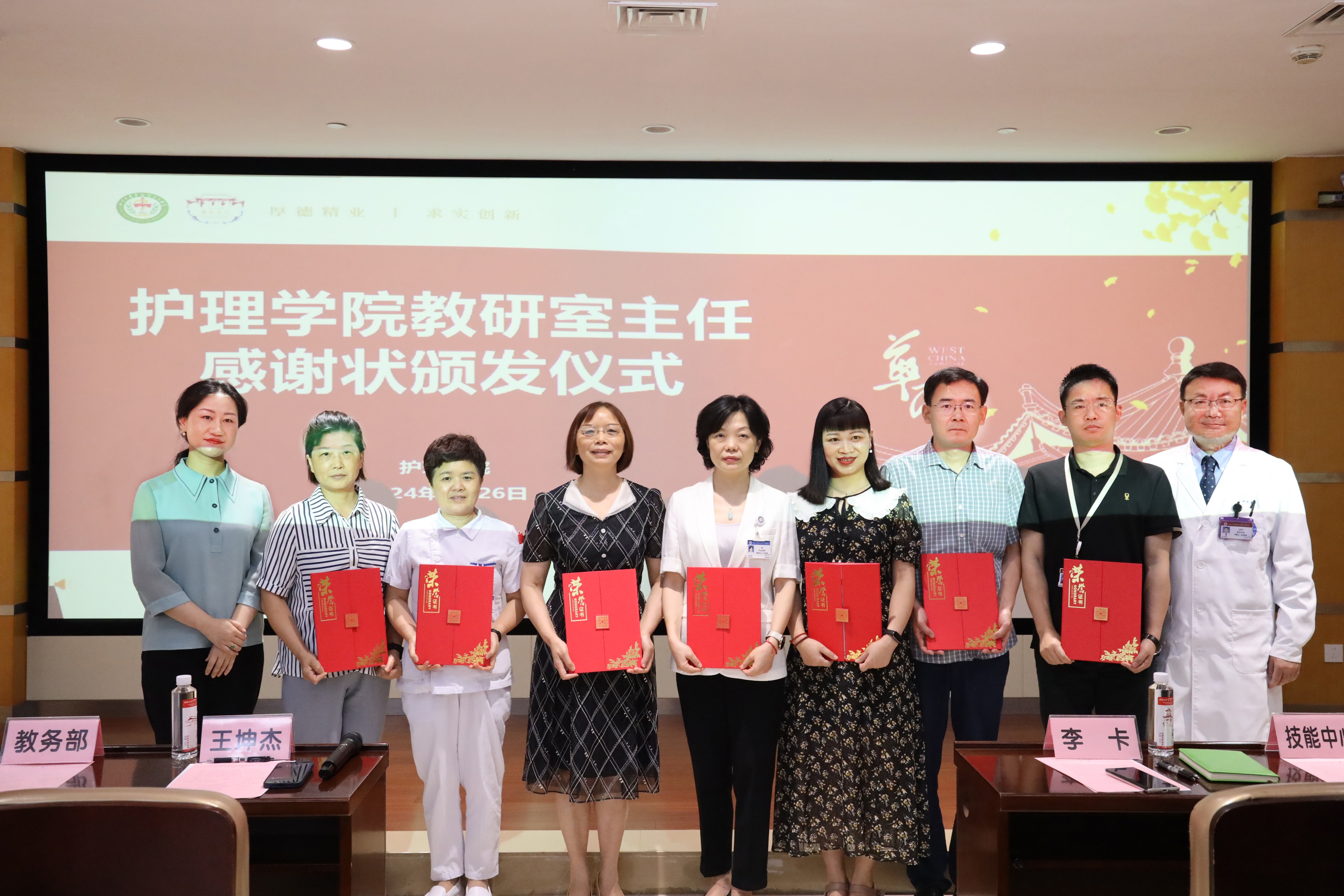 华西临床医学院/华西医院王坤杰副院长、护理学院李卡院长共同为教研室主任颁发了感谢状,以表彰他们为川大华西护理学人才培养做出的积极贡献。