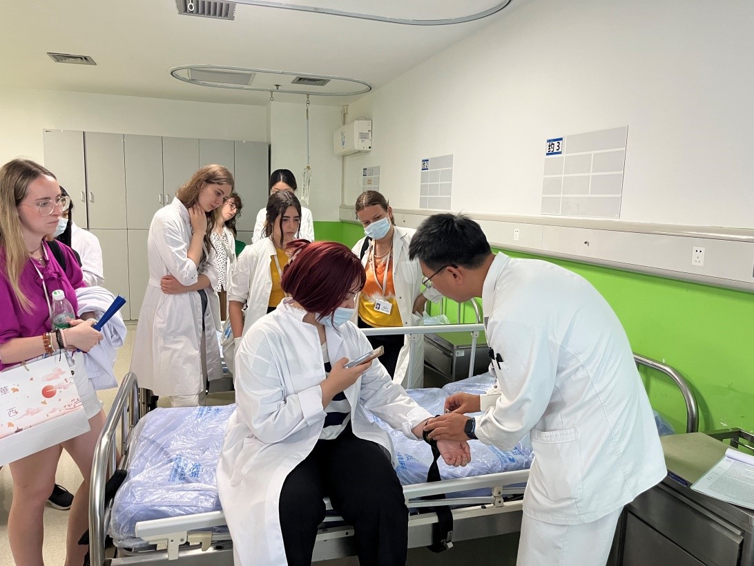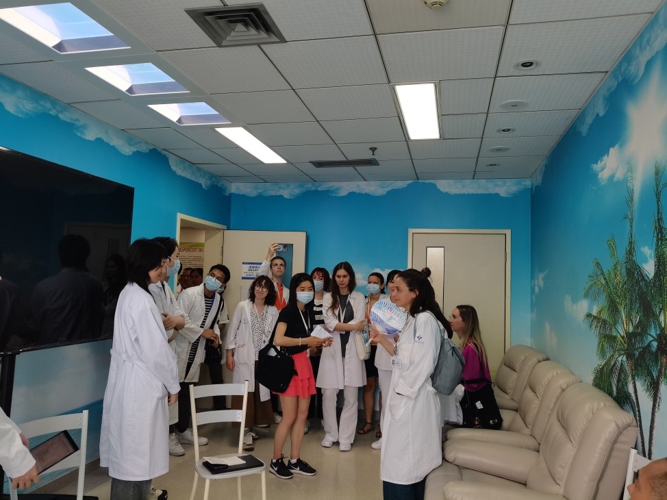 7月12日上午,365官网组织国际学生到呼吸与危重症医学科、心脏大血管外科、心理卫生中心等特色护理病房进行参观见习。在呼吸与危重症医学科,吴颖老师等带领同学们在吸入门诊学习患者教育方式、亲历门诊随访流程。在心脏大血管外科,同学们在陈秒老师等的带教下,了解心脏大血管外科主要收治疾病种类和护理特色,观摩团队抢救演练等。在心理卫生中心,陈娟老师等讲解了心理综合病房收治病种与相关物理治疗、PICU病房患者管理、儿童相关心理治疗等内容。