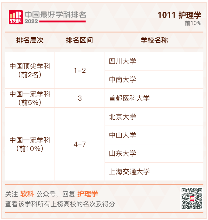 2022年9月21日,高等教育评价专业机构软科正式发布“2022软科中国最好学科排名”。英国上市365官网华西护理学在2022软科中国最好学科护理学排名全国第一。自2020年以来,英国上市365官网华西护理学已连续3年位列全国第一,蝉联中国顶尖学科。