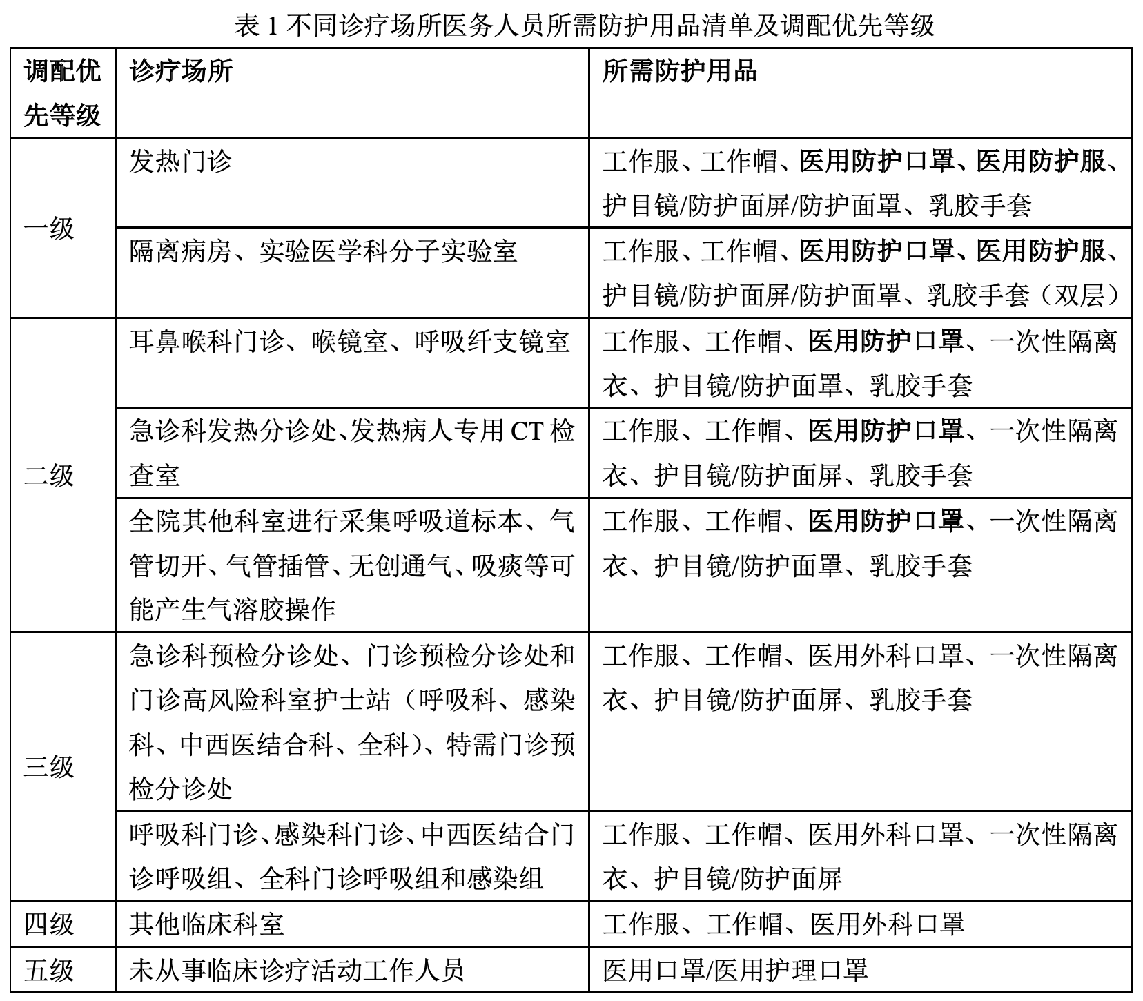 4. 确定病区防护物资调配优先等级:按医院各分区(发热门诊、隔离病房等)、实际收治病人数、工作量、人员数量,确定各区域防护物资调配优先等级。详见表1。