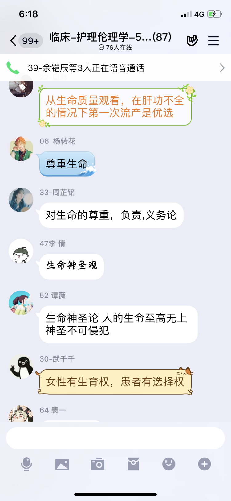 《护理伦理学》教学团队结合在中国大学MOOC平台上的视频资源(该课由护理学院开设),通过学习群,SPOC慕课堂等网络应用工具,进行首次线上教学活动。同学们通过中国大学MOOC平台学习道德与职业道德、伦理与伦理学、医学伦理学和护理伦理学的发展等视频课程并完成随堂测试,期间由张凤英老师和李琰老师在学习群与同学们结合临床案例对生命神圣论各抒己见,讨论热烈。