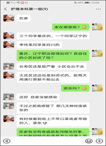 由于新冠肺炎导致的突发疫情对学生的学习和生活带来了很大的影响,有的学生更因所在区域疫情较为严重心里有些恐慌。教研室指示教学组长在教学群里将疫情信息准确传达给学生,同时教会学生新冠肺炎的基本知识、家庭防护的要点等以舒缓学生们的紧张心理提高应对能力。护理实习生是医务工作者的后备力量,在疫情面前除了不慌张还应该有所担当。因此教研室在教学中除了给予学生心理支持外还积极引导学生思考自己应有怎样的使命感。自疫情发生后,口腔医院老师不拍危险,承担了口腔急症患者的诊治工作,持续为公众推出防疫知识、口腔健康维护等科普文章,在疫情防控中贡献自己的一份力量。教学组老师在教学群中不断告诉学生们老师在做什么,怎么去做的,在致敬这些逆行的提灯天使们的同时,鼓励学生们做家庭、社区的宣传员,在科学抗疫时勇敢前行。