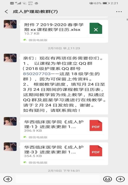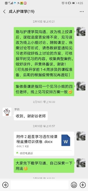 接到通知当天,课程负责人谷波老师迅速建立《成人护理学护-1》和《成人护理学-3》的助教群,讨论线上教学的操作流程,并布置任务,共同制定出多套上课备选方案、教师线上教学等流程、学生讨论流程及规则,尽最大努力保证线上教学的顺利开展。