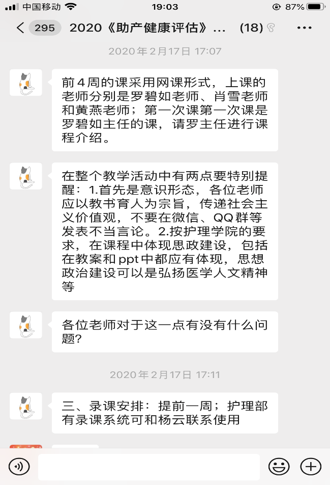 停课不停教,停课不停学。在疫情防控的特殊时期,妇产科教研室本学期负责的三门主干课程《母婴护理学》、《助产健康评估》和《妇幼保健》在教研室主任任建华副教授的带领下,积极响应护理学院的号召,精心筹备并开展线上教学工作。