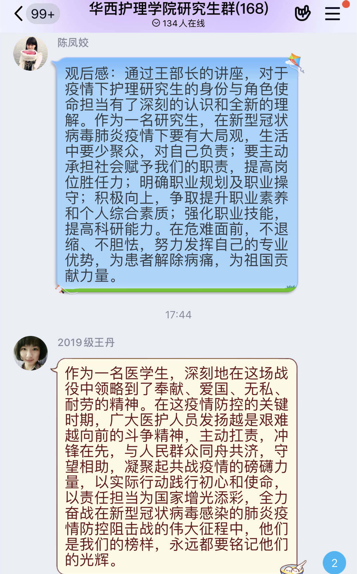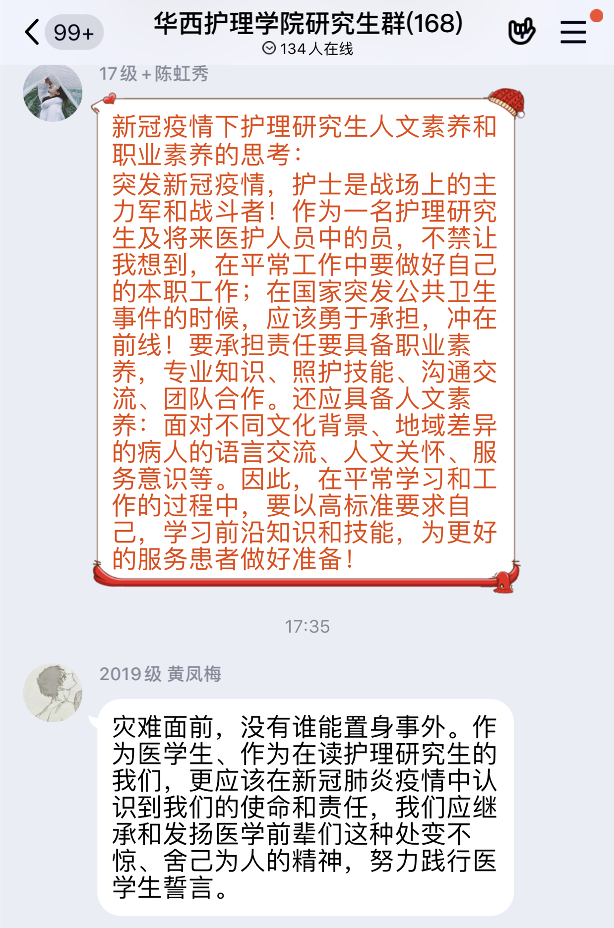 同学们学习后积极发表自己的感悟,认为护理研究生应努力学习专业知识和技能,培养严谨求实的科研态度,提升人文修养和职业素养。当面临重大公共卫生事件时,具备大局观,勇于担当,肩负起“维护和促进人类健康”的责任使命。