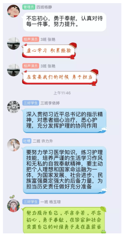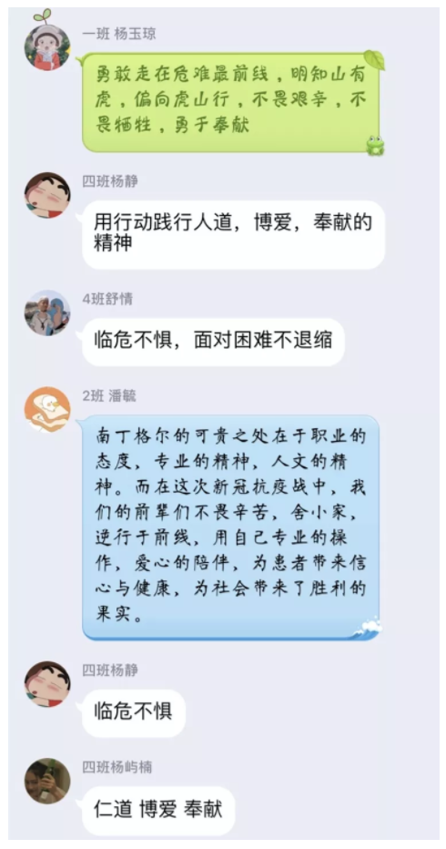 同学们学习后纷纷表示,为南丁格尔职业的态度、专业的精神、人文的关怀而折服。特别是在这次新冠抗疫战中,护理老师们明知山有虎,偏向虎山行!在危难时刻挺身而出,舍小家,逆行于疫情一线,为社会带来了抗疫的阶段性胜利。同学们也会努力学习医学知识,练习护理技能,培养严谨的生活学习作风和无私的自我奉献精神,主动把个人理想和国家命运融为一体,为国家发展、社会进步、民族富强,奠定坚实的基础,为担当历史责任做好充分准备。
