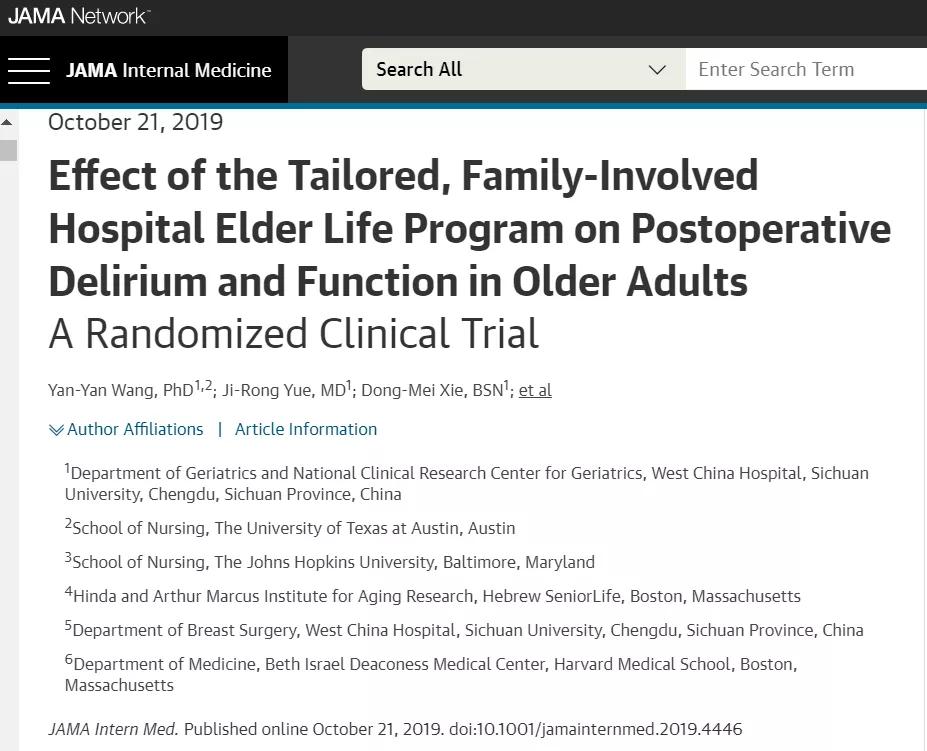 365官网护理学博士、在站博士后王艳艳作为第一作者,老年医学中心岳冀蓉教授为通讯作者,在国际著名医学期刊JAMA Internal Medicine(IF=20.768)以原创性论著形式发表。该研究试验结果提出了更加符合我国国情的老年术后谵妄的个性化...