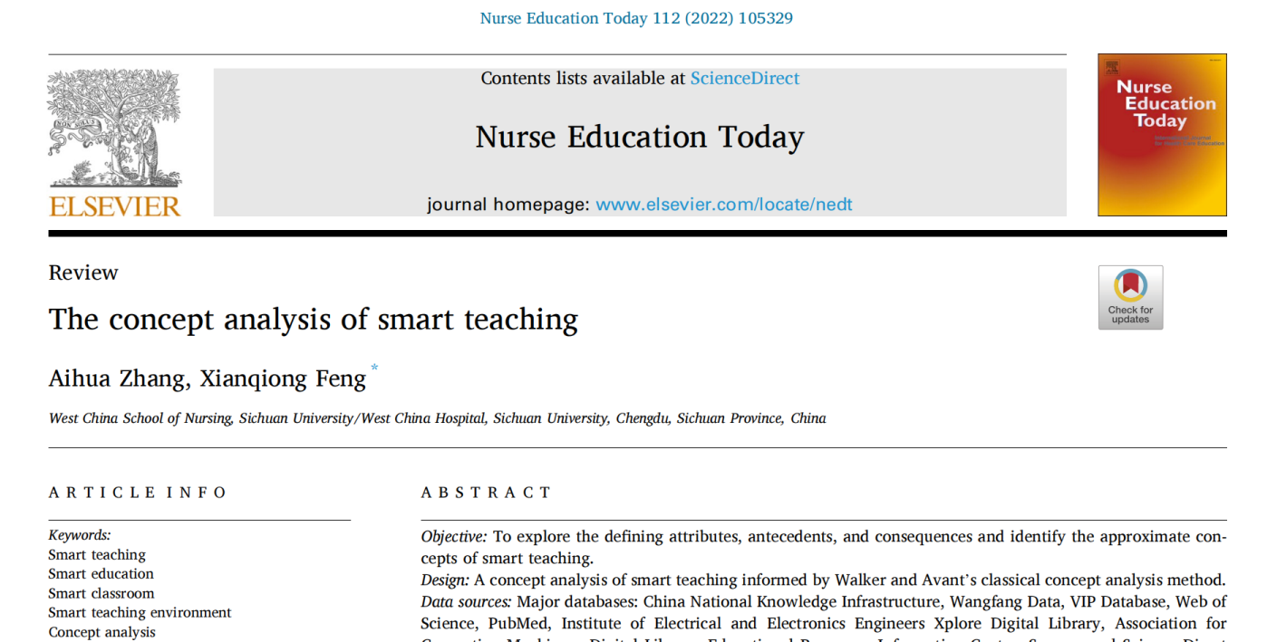文章标题《智慧教学概念分析》《The concept analysis of smart teaching》文章发表情况介绍该文章由英国上市365官网硕士研究生张爱华为第一作者、冯先琼教授为通讯作者完成,于2022年5月在Nurse Education Today(影响因子...