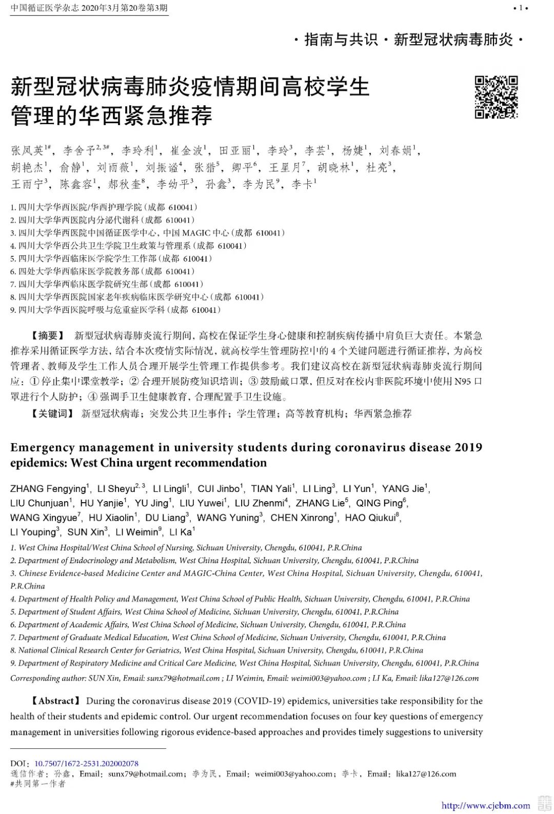 川大华西护理学联合临床医学、教育学、循证医学、公共卫生学等多学科专家采用循证医学方法,结合本次疫情实际情况,就高校疫情防控中的教学管理问题,在《中国循证医学杂志》发布紧急推荐,为新冠疫情防控期间高校学生管理提供借...